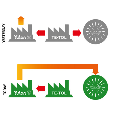 Heating energy in the form of hot water, which shall now be employed by Atlantis Water Park, is produced by Julon as part of the ECONYL® process. This energy is partly re-used by Julon in its production processes, while the rest has up until now presented a surplus of energy that had yet to be exploited.