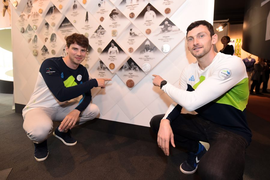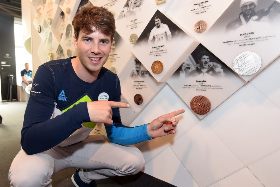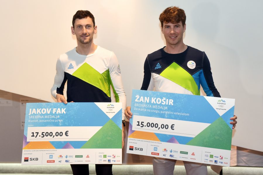 Medaljista, srebrni biatlonec Jakov Fak in bronasti deskar Žan Košir sta prejela svoji odličji na ”steni slavnih”, predsednik OKS Bogdan Gabrovec pa jima je podelil denarno nagrado s strani krovne športne organizacije, za uspeha, ki sta ju dosegla v daljni Južni Koreji.